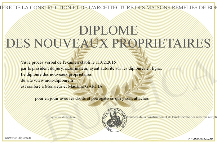 Envoyez par email votre Diplôme des nouveaux propriétaires personalisé