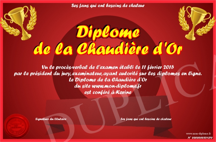 Envoyez par email votre Diplôme de la Chaudière d'Or personalisé