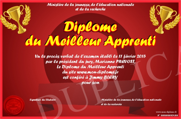 Envoyez par email votre Diplôme du Meilleur Apprenti personalisé