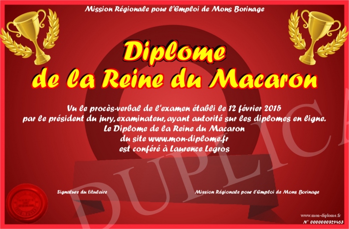 Envoyez par email votre Diplôme de la Reine du Macaron personalisé