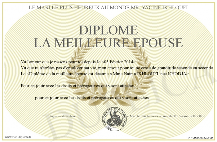 Envoyez par email votre Diplôme la meilleure épouse personalisé