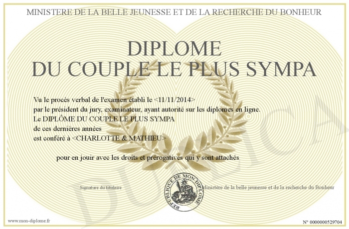 Envoyez par email votre Diplome du couple le plus sympa personalisé