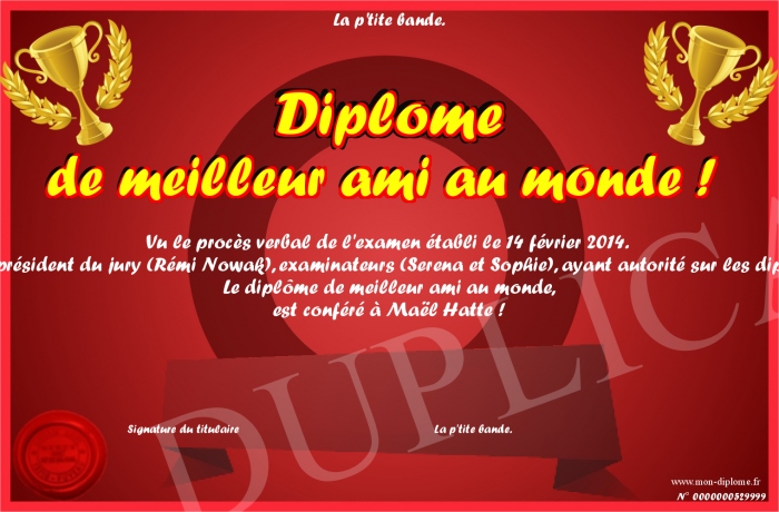 Envoyez par email votre Diplôme de meilleur ami au monde ! personalisé