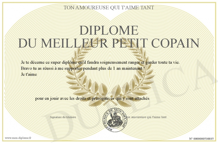 Envoyez par email votre diplome du meilleur petit copain personalisé