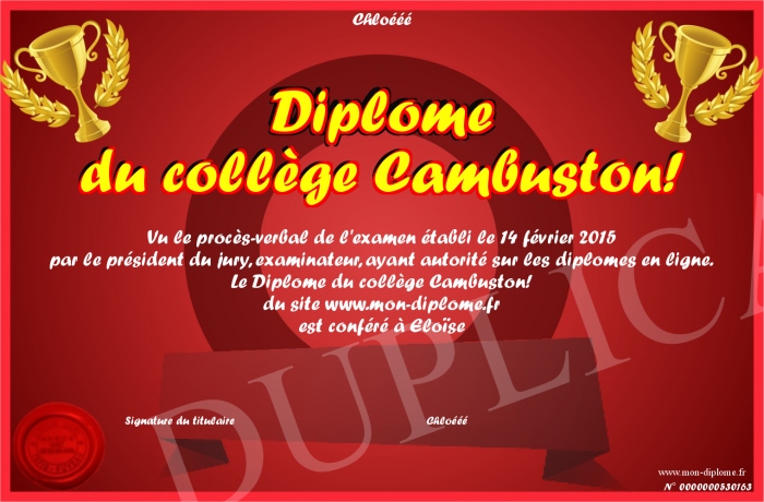 Envoyez par email votre Diplôme du collège Cambuston! personalisé