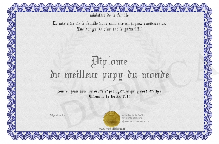 Envoyez par email votre Diplôme du meilleur papy du monde personalisé