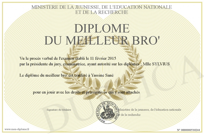 Envoyez par email votre Diplôme du meilleur bro' personalisé
