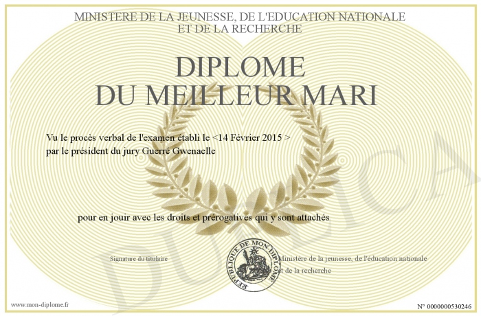 Envoyez par email votre Diplôme du Meilleur Mari personalisé