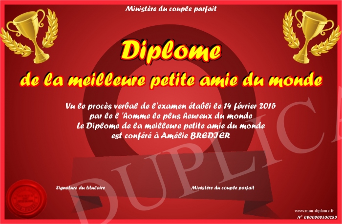 Envoyez par email votre Diplôme de la meilleure petite amie du monde personalisé