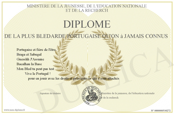 Envoyez par email votre Diplôme de La Plus Blédarde Portugaise Qu'on à Jamais connus personalisé