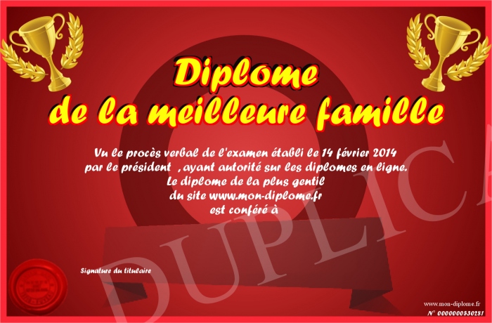 Envoyez par email votre Diplôme de la meilleure famille personalisé
