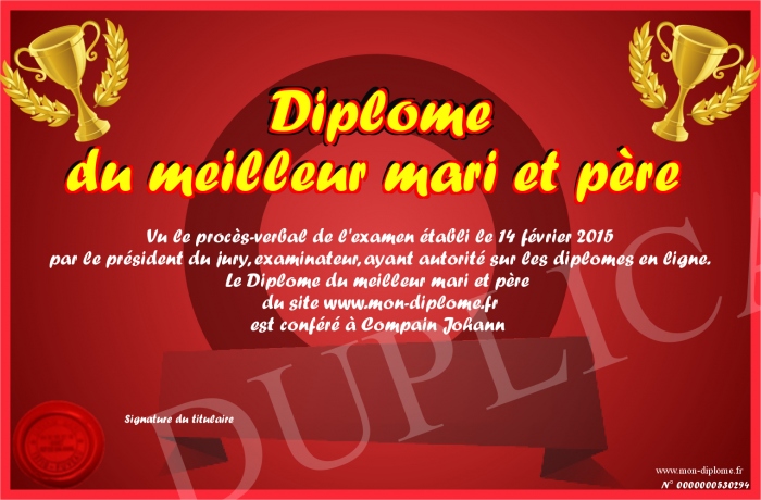 Envoyez par email votre Diplôme du meilleur mari et père personalisé