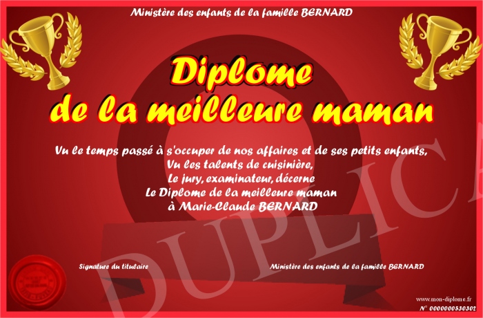 Envoyez par email votre Diplôme de la meilleure maman personalisé