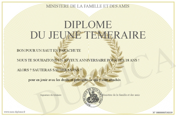 Envoyez par email votre DIPLOME DU JEUNE TEMERAIRE personalisé