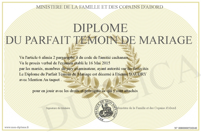 Envoyez par email votre Diplôme du Parfait Témoin de Mariage personalisé