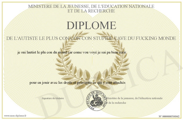 Envoyez par email votre Diplôme de l'autiste le plus con con con stupide cave du fucking monde personalisé