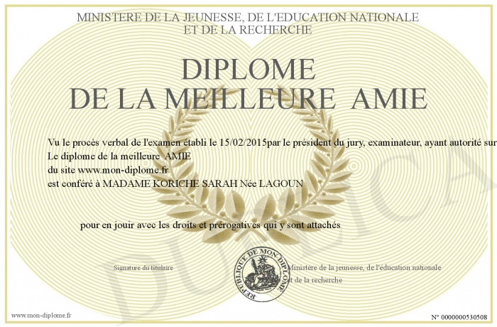 Envoyez par email votre Diplôme de la meilleure AMIE personalisé