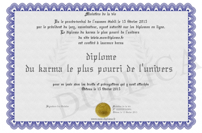 Envoyez par email votre diplôme du karma le plus pourri de l'univers personalisé