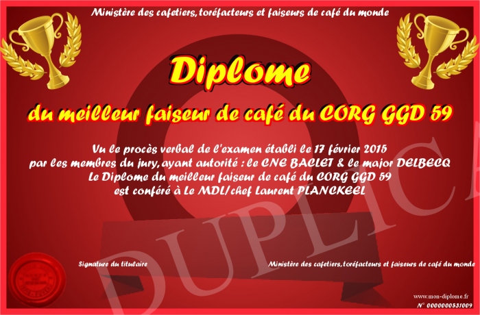 Envoyez par email votre Diplôme du meilleur faiseur de café du CORG GGD 59 personalisé
