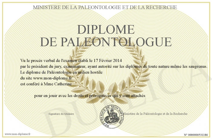 Envoyez par email votre Diplôme de PALEONTOLOGUE personalisé