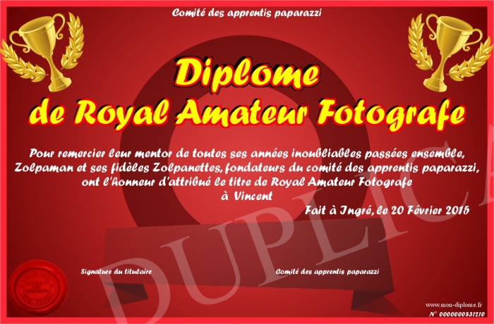 Envoyez par email votre Diplôme de Royal Amateur Fotografe personalisé
