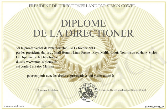 Envoyez par email votre Diplôme de la Directioner personalisé