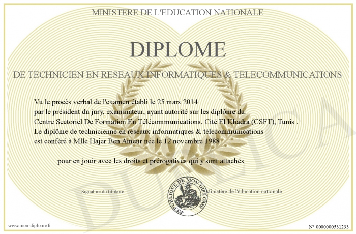Envoyez par email votre Diplôme de Technicien en Réseaux Informatiques & Télécommunications personalisé