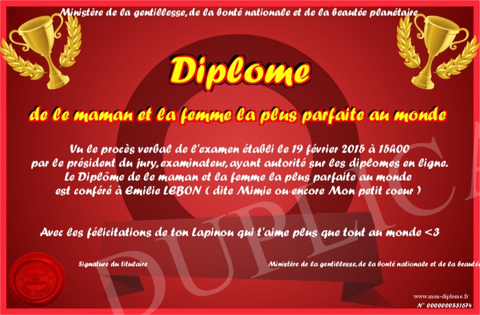 Envoyez par email votre Diplôme de le maman et la femme la plus parfaite au monde personalisé