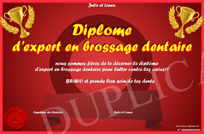 Envoyez par email votre Diplôme d'expert en brossage dentaire personalisé