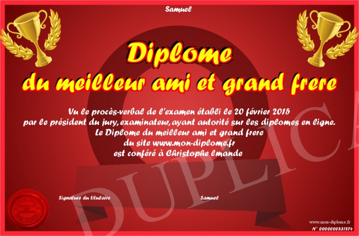Envoyez par email votre Diplôme du meilleur ami et grand frere personalisé