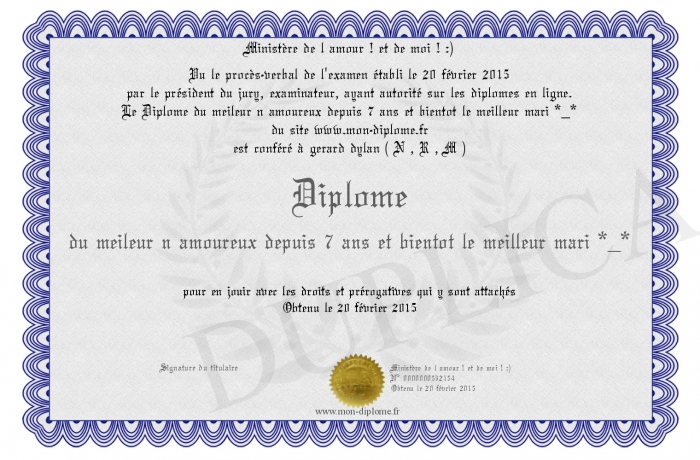 Envoyez par email votre Diplôme du meileur n amoureux depuis 7 ans et bientot le meilleur mari *_* personalisé