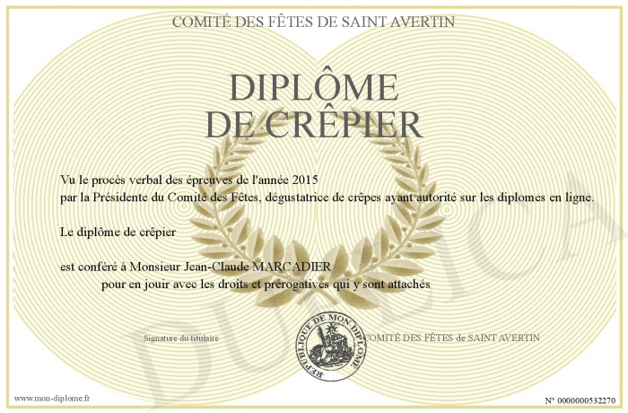 Envoyez par email votre DIPLÔME de CRÊPIER personalisé