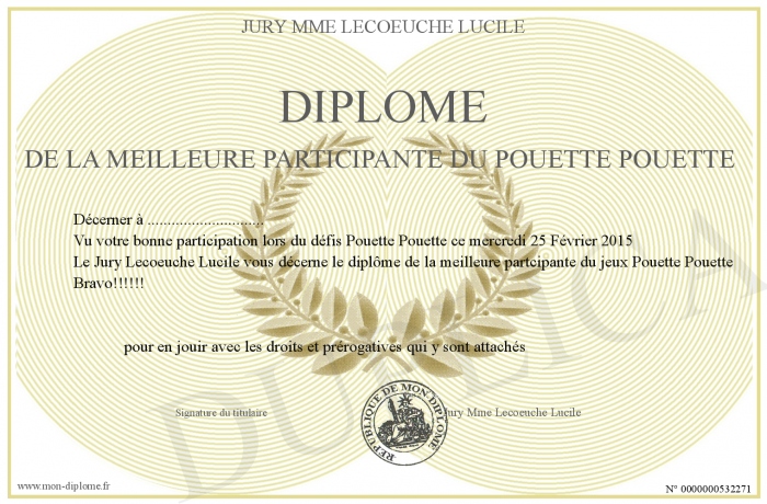 Envoyez par email votre Diplôme de la meilleure participante du Pouette Pouette personalisé
