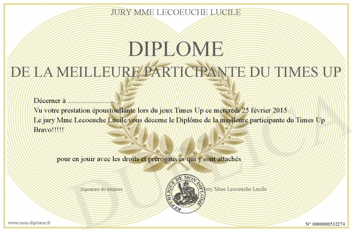 Envoyez par email votre Diplôme de la meilleure participante du Times Up personalisé