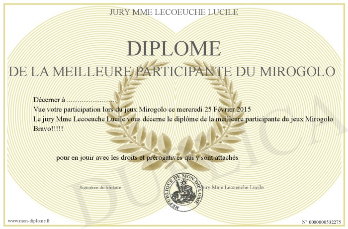 Envoyez par email votre Diplôme de la meilleure participante du mirogolo personalisé