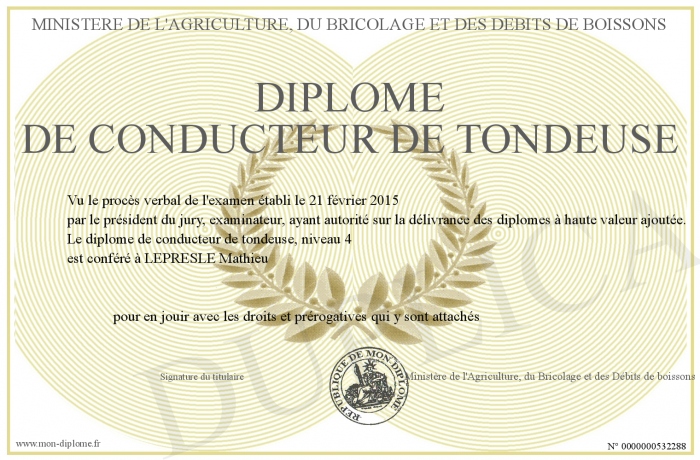 Envoyez par email votre diplôme de conducteur de tondeuse personalisé