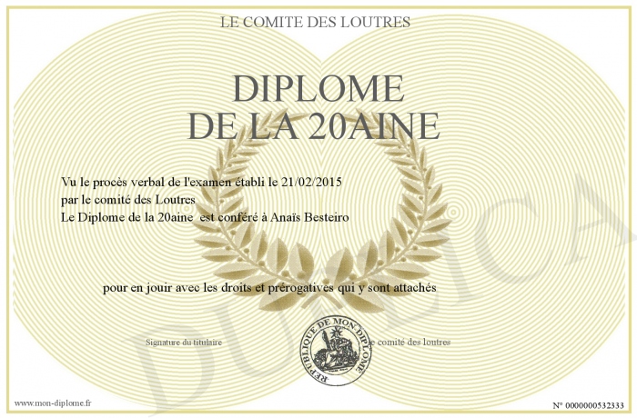Envoyez par email votre Diplôme de la 20aine personalisé