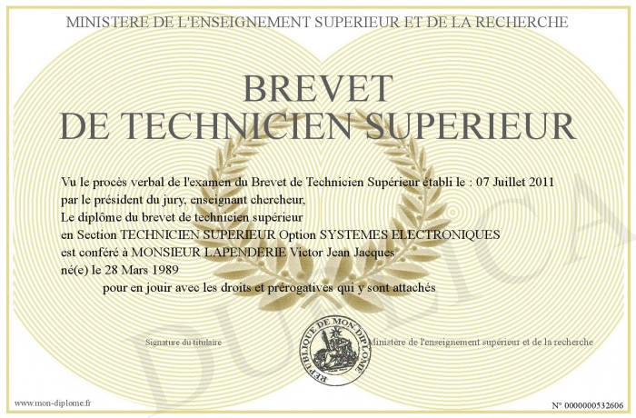 Envoyez par email votre Brevet de Technicien Supérieur personalisé