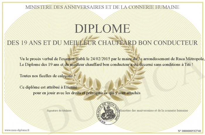Envoyez par email votre Diplôme des 19 ans et du meilleur chauffard bon conducteur personalisé