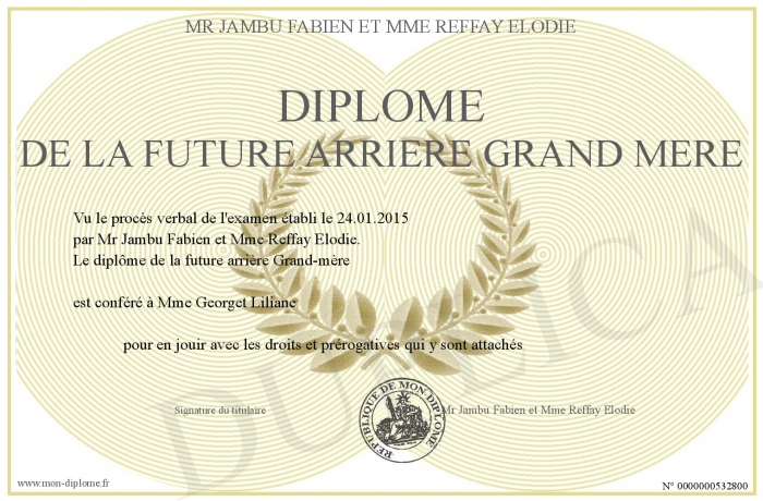Envoyez par email votre Diplôme de la Future arriere Grand Mere personalisé