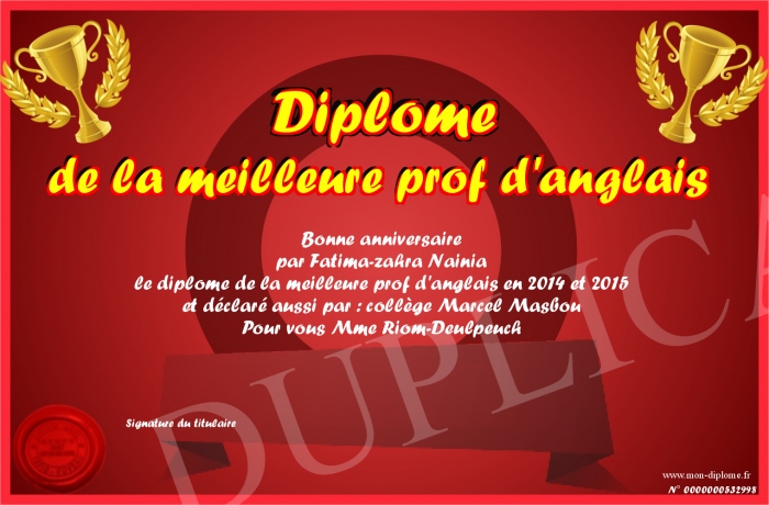 Envoyez par email votre Diplôme de la meilleure prof d'anglais personalisé