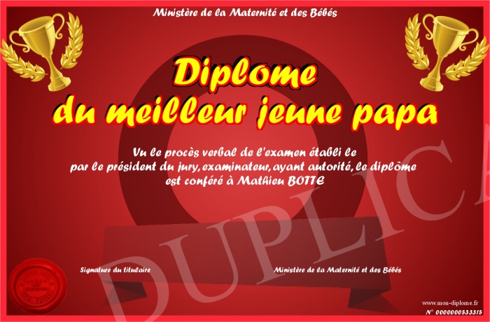 Envoyez par email votre Diplôme du meilleur jeune papa personalisé