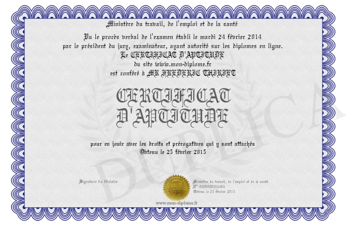 Envoyez par email votre CERTIFICAT D'APTITUDE personalisé