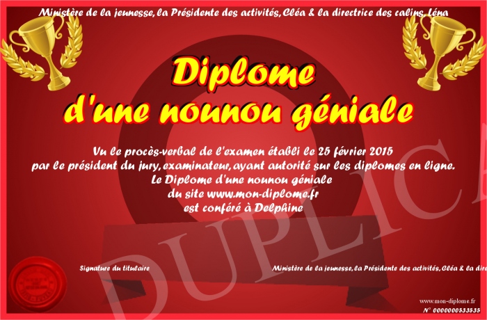 Envoyez par email votre Diplôme d'une nounou géniale personalisé
