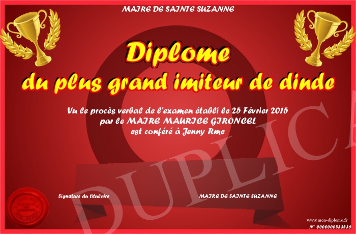 Envoyez par email votre Diplôme du plus grand imiteur de dinde personalisé