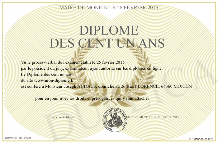 Envoyez par email votre Diplôme des cent un ans personalisé