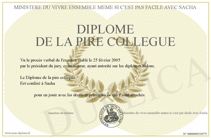 Envoyez par email votre Diplôme de la pire collègue personalisé