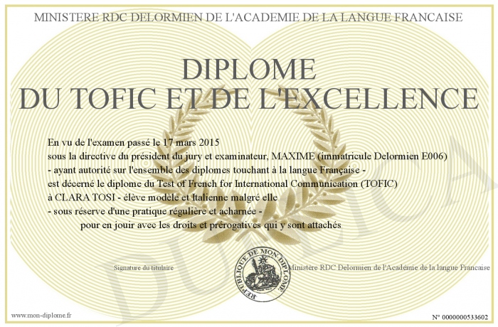 Envoyez par email votre Diplôme du TOFIC et de l'excellence personalisé