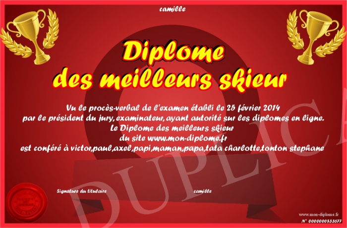 Envoyez par email votre Diplôme des meilleurs skieur personalisé