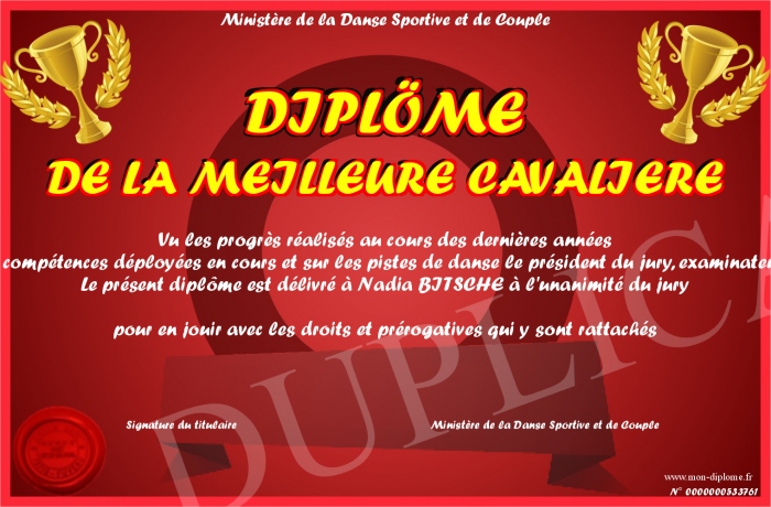 Envoyez par email votre DIPLÖME DE LA MEILLEURE CAVALIERE personalisé